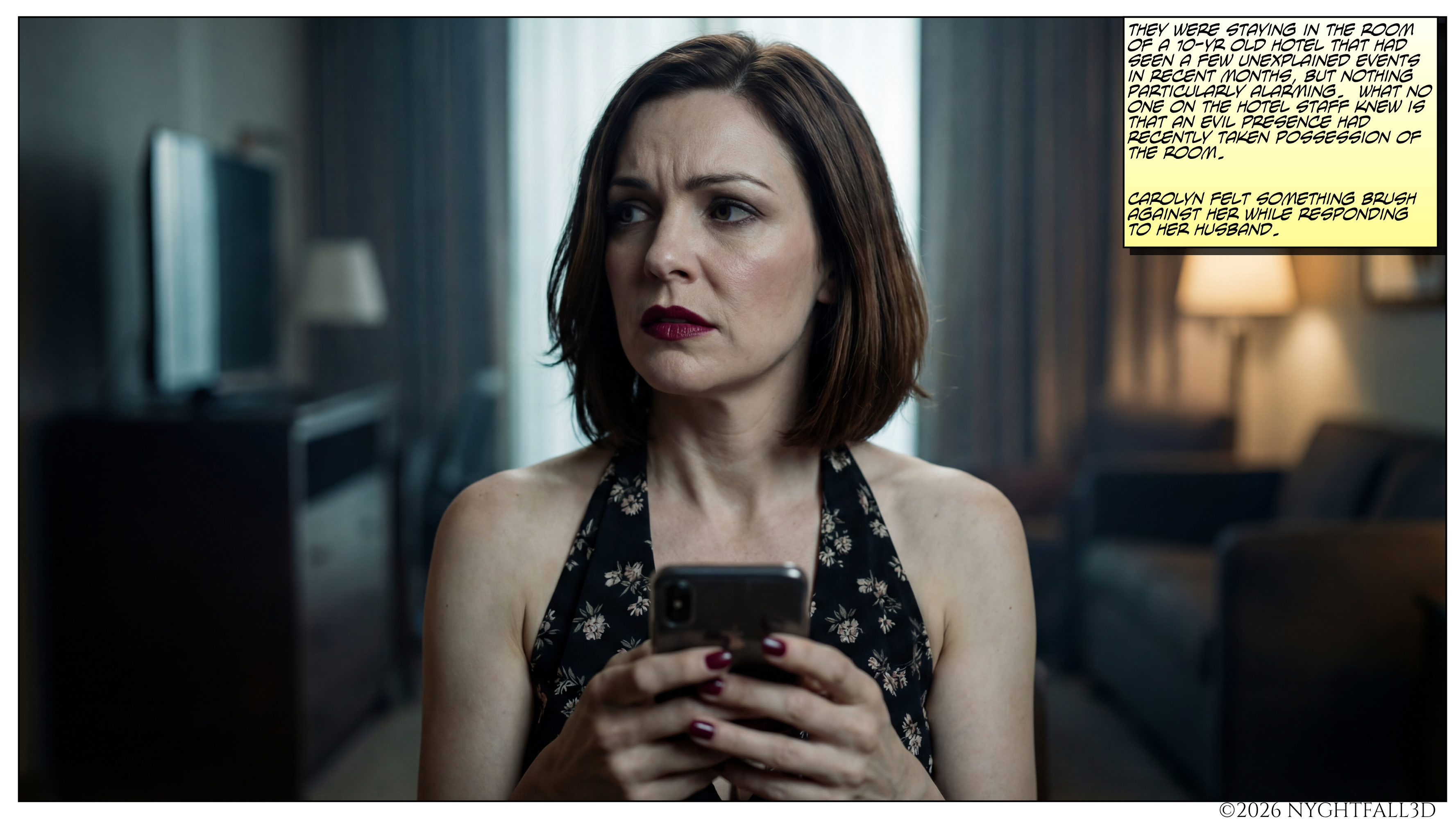 Multie-Page AI Comics A housewife is strangled by an evil presence in a hotel room. Room 1410: Page 1 Room 1410: Page 2 Room 1410: Page 3 Room 1410: Page 4 Room 1410: Page 5 Room 1410: Page 6 Room 1410: Page 7 Room 1410: Page 8 Room 1410: Page 9 Room 1410: Page 10 Room 1410: Page 11