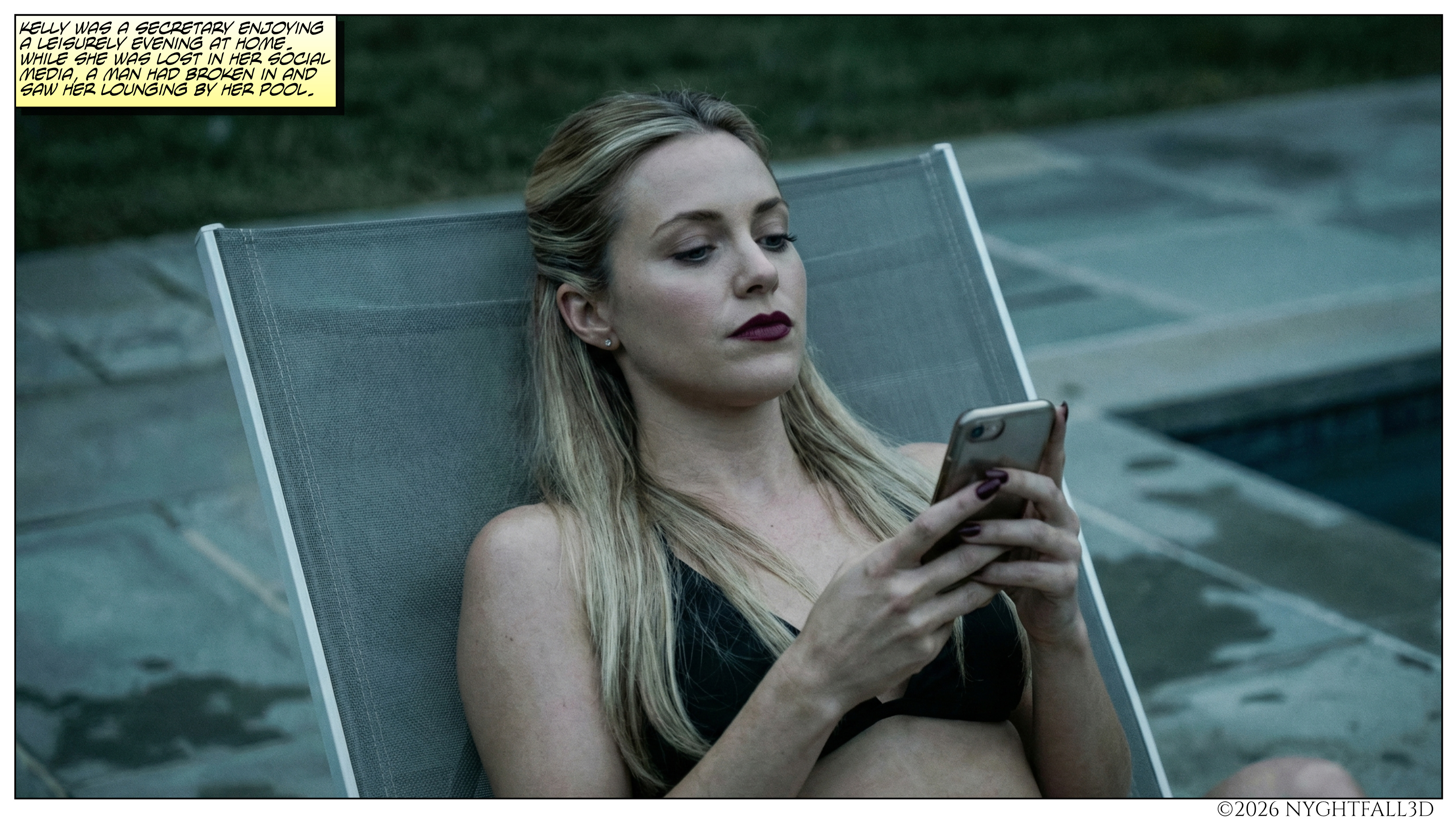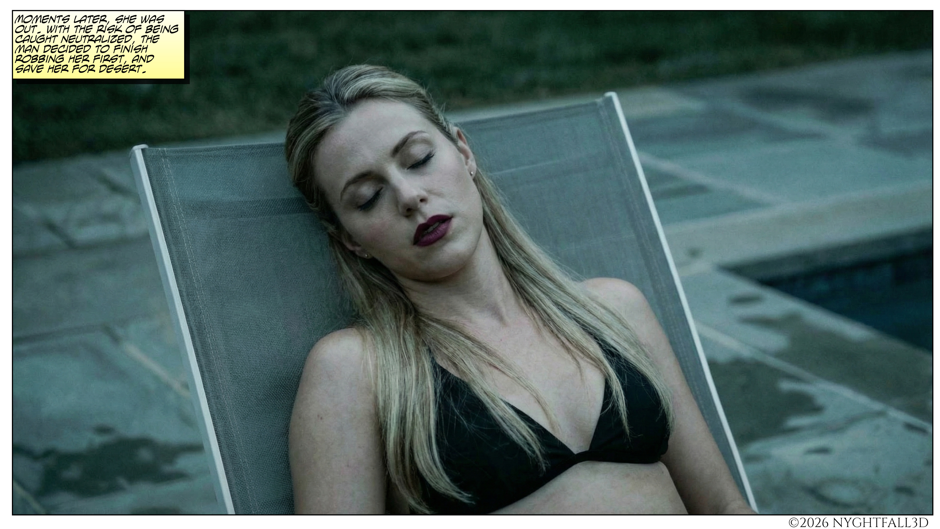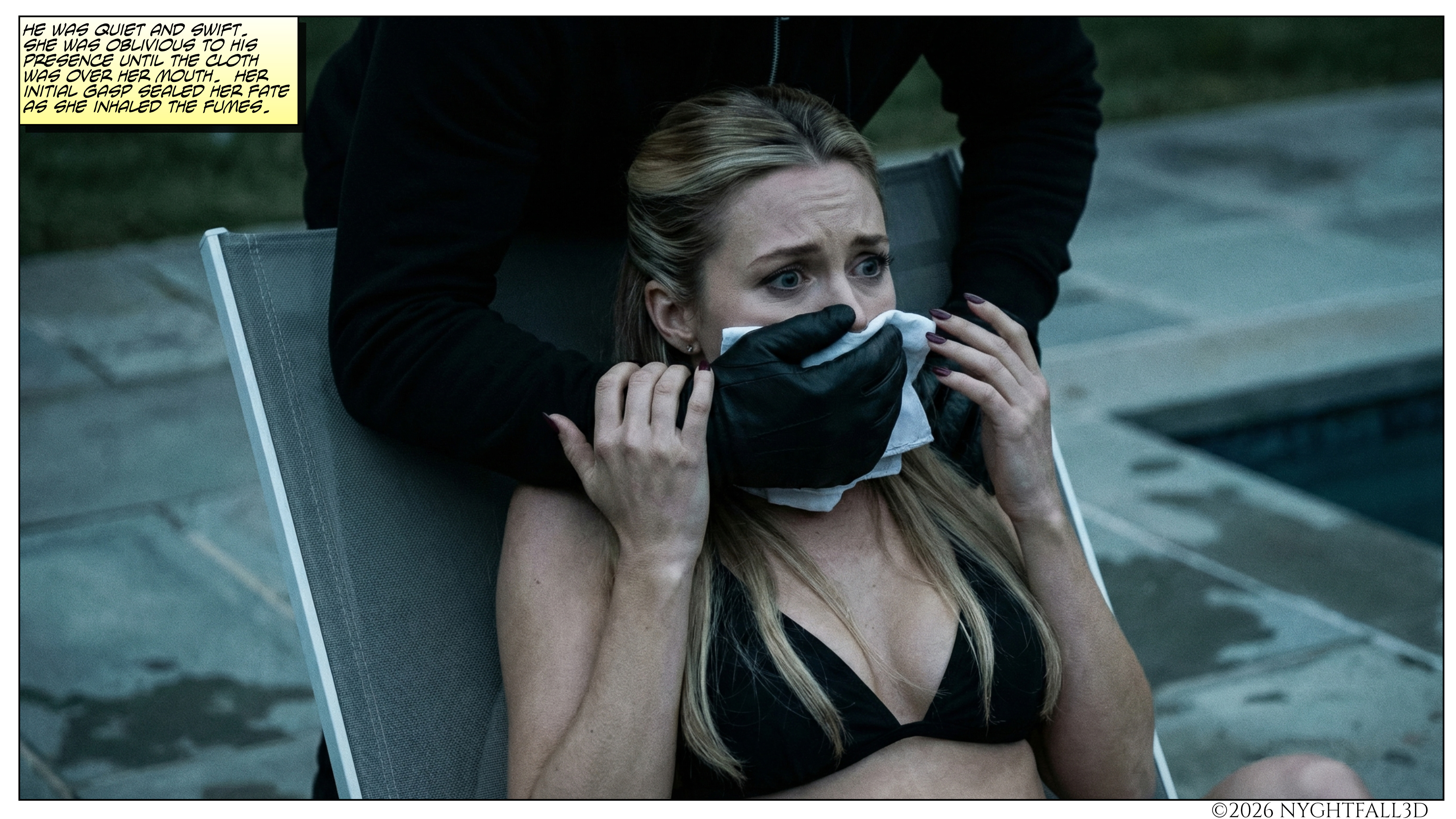 Multie-Page AI Comics A woman lounging by her pool is chloroformed by a burglar. The Silent Pool: Page 1 The Silent Pool: Page 2 The Silent Pool: Page 3 The Silent Pool: Page 4 The Silent Pool: Page 5