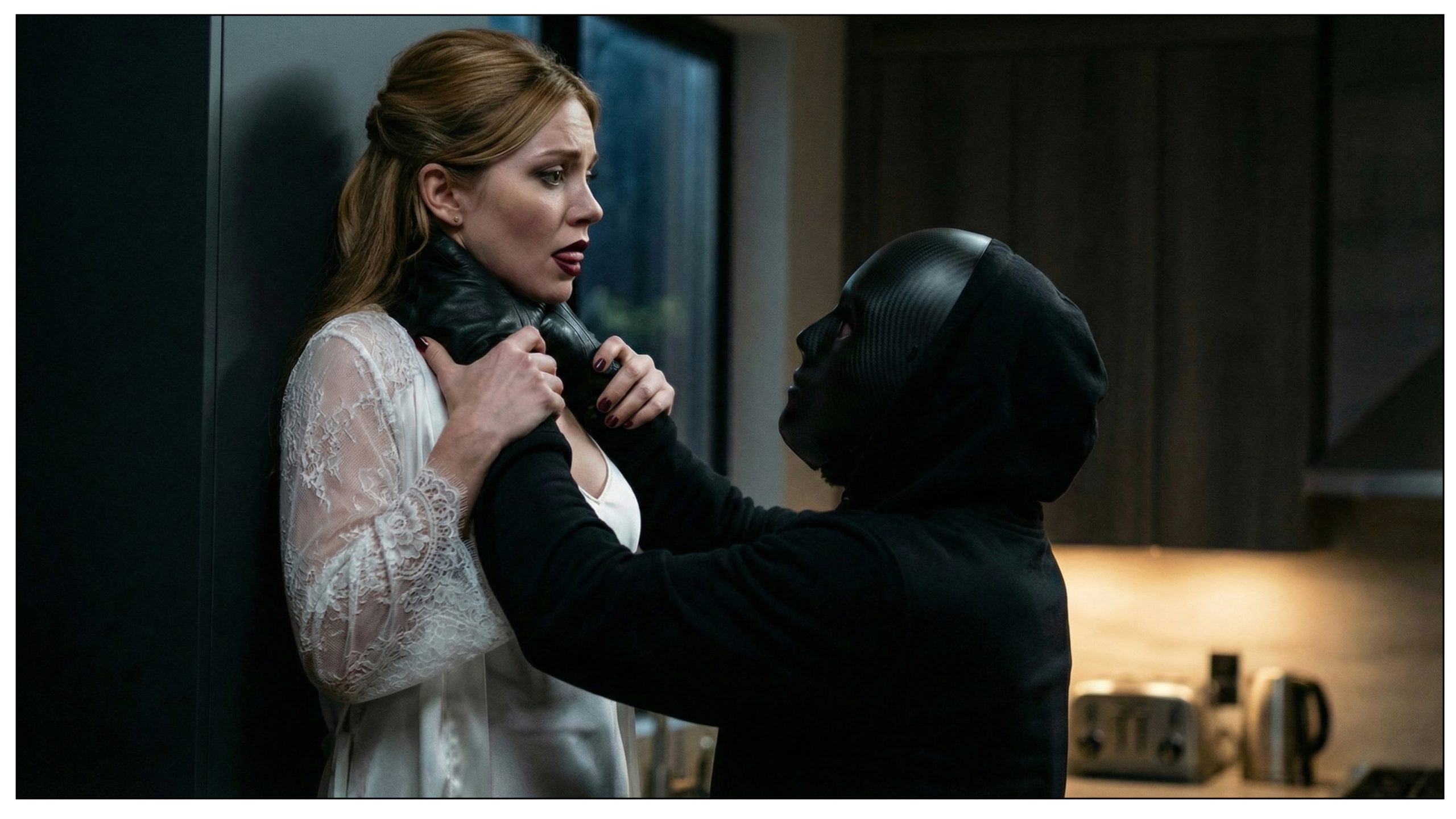 In a nutshell, NB Pro doesn’t like human-on-human interaction when violence is explicit and death is the only logical outcome. I can imply it, I just can’t show it it. Amusingly, it doesn’t mind abduction scenarios, or people being subdued. That’s why I’ve been able to render bondage, neck grabs + hand gags, and chloroforming themes so easily – no one’s being killed. đ